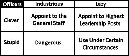 Von Moltke said there were four qualities he noted in officers: Clever, Stupid, Industrious, and Lazy. Clever, lazy officers should be discovered, sought after, and made Commanders, because they “make the right things happen in the easiest possible manner.” Clever and industrious officers should be retained and assigned to the General Staff, because they “direct the right things to happen.” Stupid, lazy officers should be retained, for they could “follow orders and perform the routine tasks that must be performed by an officer.” Stupid, Industrious officers, however, were dangerous. They should be “destroyed,” removed from the service as quickly as possible. They “will make things happen – the wrong things.”