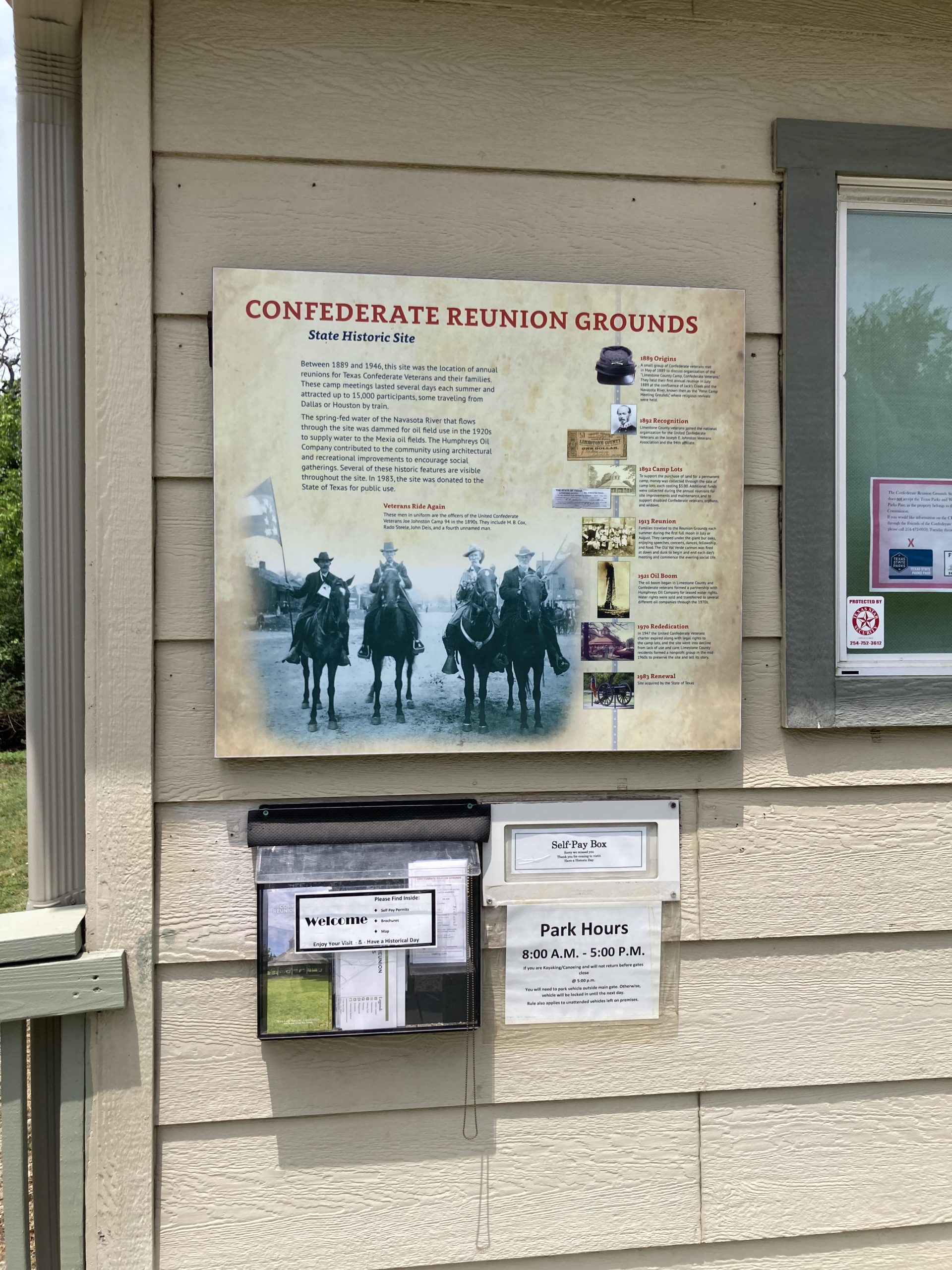 But it was the reunion grounds that drew my interest, so I turned down a typical Texas country road and followed the signs to the site along the Navasota River, where, from the lates 1880s until 1946, Confederate veterans and their descendants held reunions to commemorate the war. The town lay at an easy distance from veterans from both Houston and Dallas to reach — meaning reunions drew large crowds.