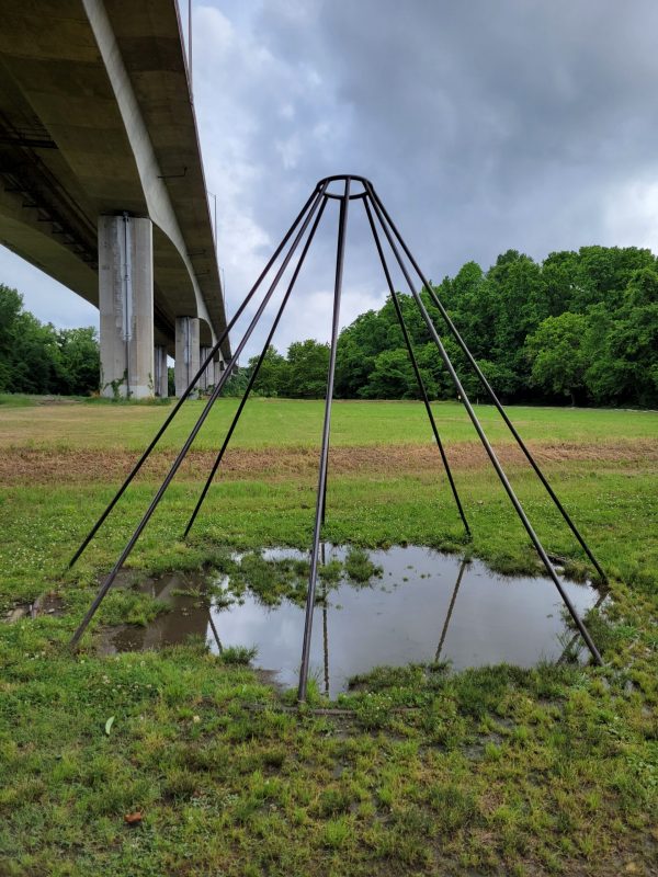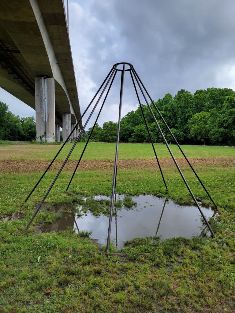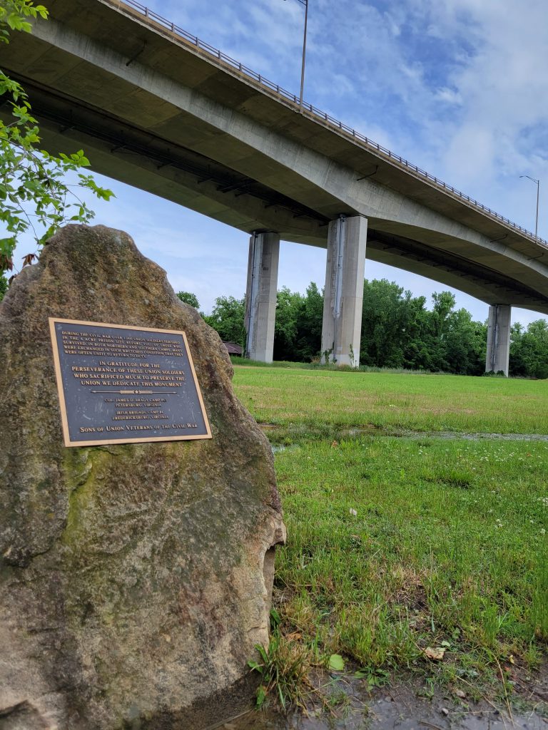 A metal frame stands near the trail map panel. I think it’s probably leftover from the post war metal works on this location; there’s nothing that indicates its a monument or memorial. Yet, it looks like an artistic impression of a Sibley tent, one of the few forms of shelter given to the Union prisoners here on Belle Isle. It’s been raining and a large puddle has formed beneath the metal. When the stray beams of sunlight catch the water, the metal, the highway bridge, and the sky are mirrored. Layers of history are embedded on this “accursed island,” and now we are here. What do we see? What do we learn? What stories do we take away from this place of captivity, hardship, and death? Belle Isle — like other prison camps — is connected to the battlefields that we walk and explain in writing and in tours. In the coming weeks, I want to think about how to weave the accounts of “the missing” into more teaching moments.