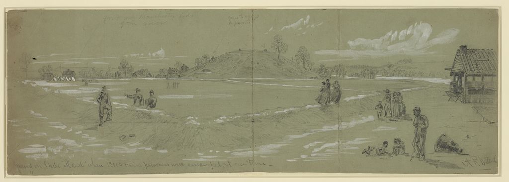 Union artist Alfred Waud sketched Belle Isle Prison Camp toward the end of the war, probably after the camp had closed. Note the earthworks dead line. There would have been tents inside the dead line when the camp was occupied. (Library of Congress)