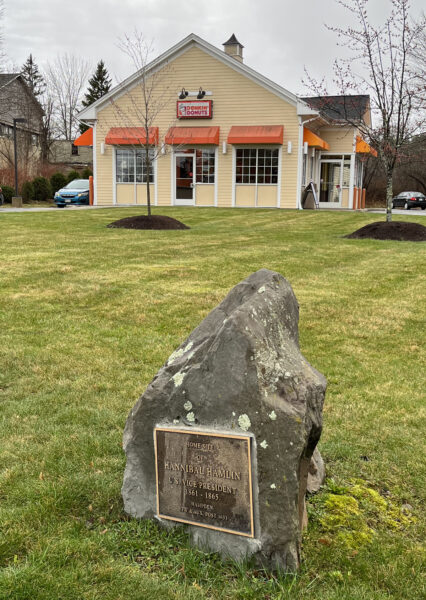 An obscure plaque fastened to a small boulder marks the site where Vice President Hannibal Hamlin lived in Hampden, Maine. Today a nationally known coffee shop occupies the Hamlin homestead. Imagine the insider information that the vice president might offer while sitting down to coffee and a doughnut!