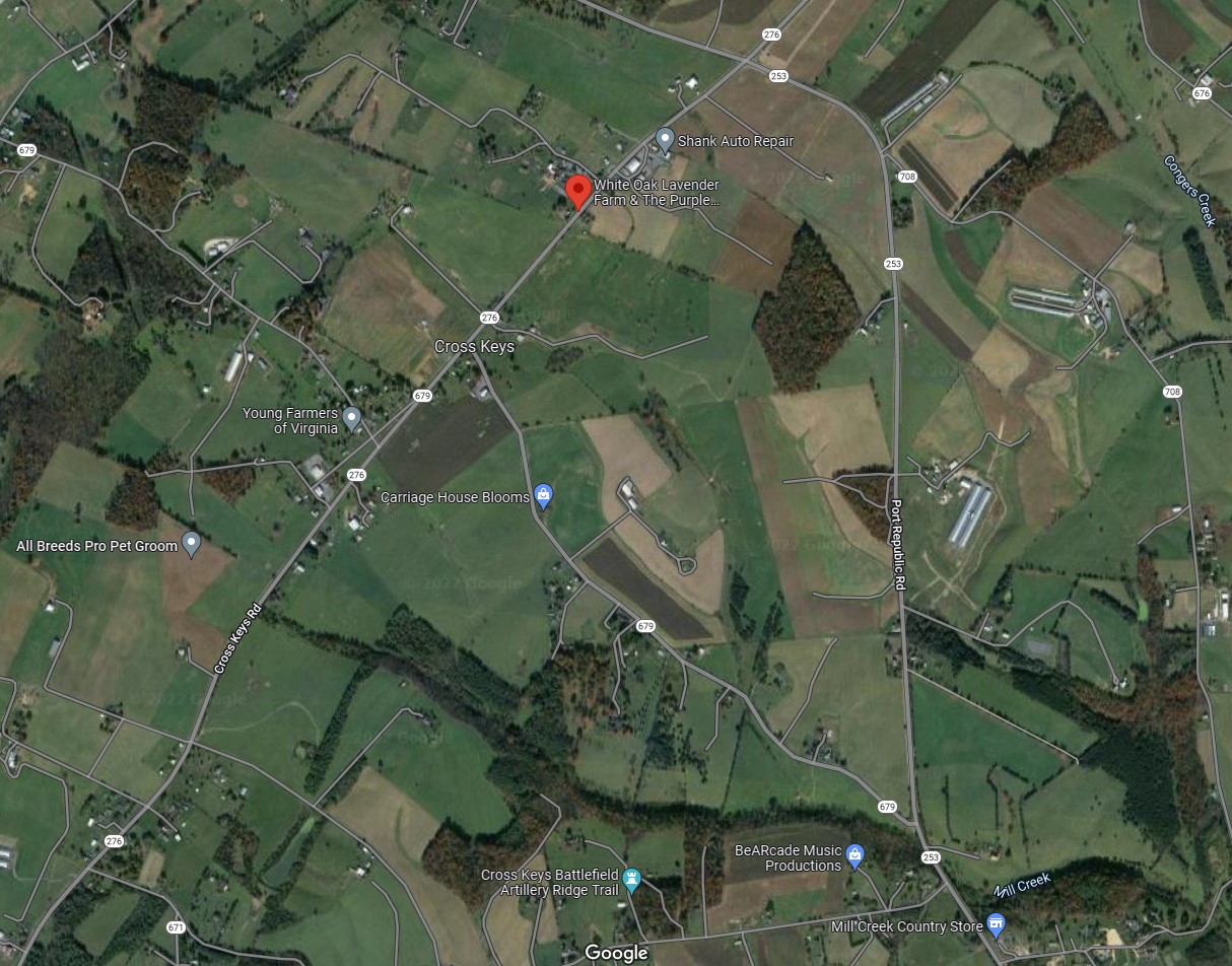 On this modern screenshot map, you’ll see the red/orange marker showing the location White Oak Lavender Farm. Note the sweeping turn of that road (Route 253) in the middle of the map.