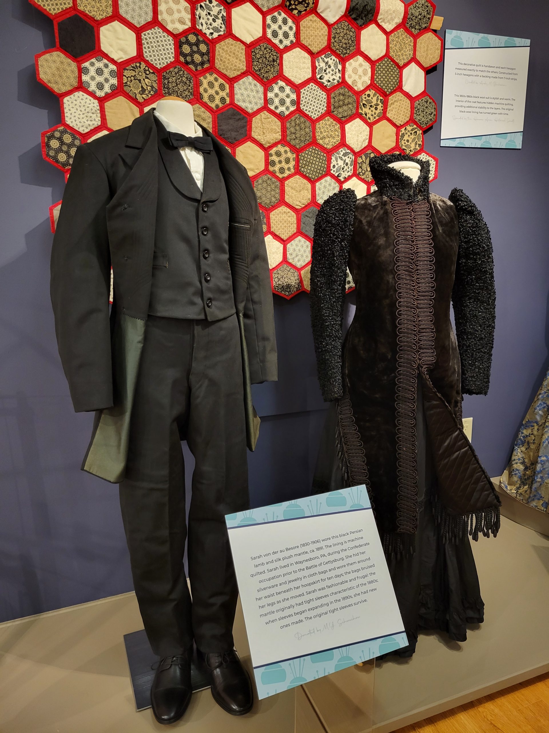 This black dress (right) belonged to a woman who lived in Waynesboro, Pennsylvania. The dress is post-war era, but during the Gettysburg Campaign, the woman who wore it hid her silver and jewelry under her hoopskirt so the Confederates wouldn’t find the valuables.
