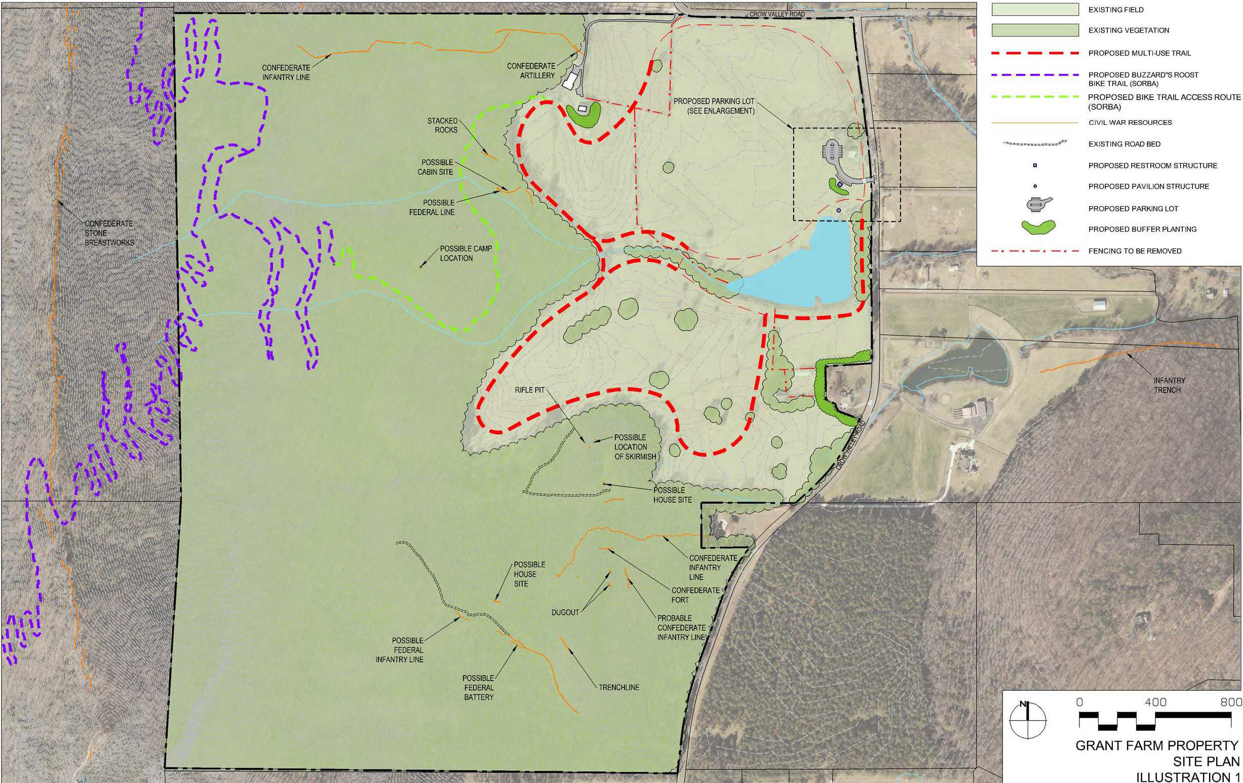 In 2003, the Whitfield County Board of Commissioners used state and federal grants to buy 650 acres on Rocky Face Ridge to help preserve Civil War fortifications along the ridge and keep it as greenspace. In 2014 the county acquired the Grant Farm, 301 acres abutting what they already owned, and the site of two 1864 battles, as well as the site of Confederate camps in the winter of 1863-64 following the Battle of Chattanooga.