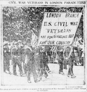 The Civil War veterans mentioned in the quoted news article from The Times were quite the active group in the early twentieth century. They paraded through London’s streets when the United States entered World War One, published pamphlets, and later held Memorial Day commemorations at the Lincoln Statue.