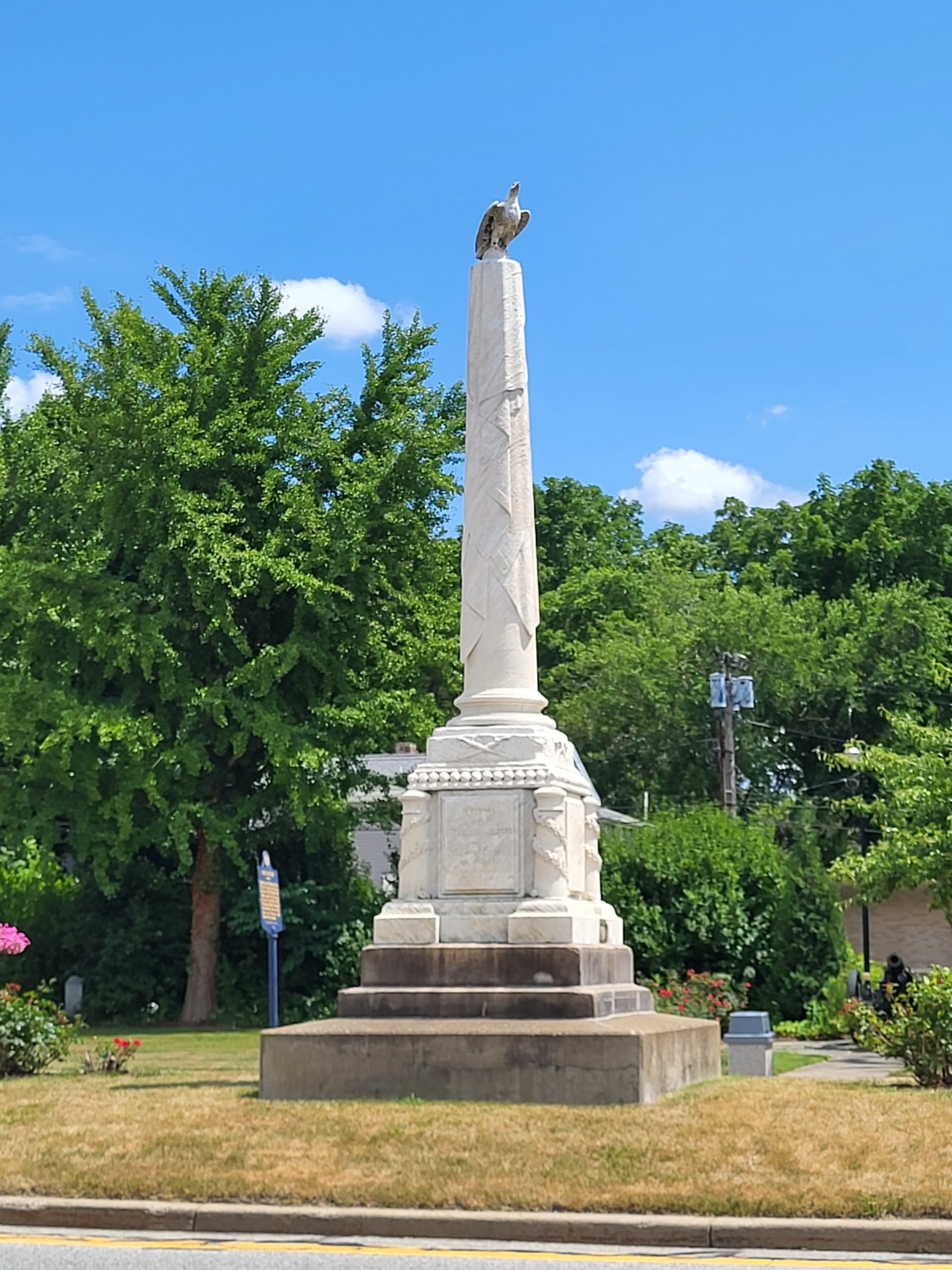 Paid for by Dan Rice and created by sculptor Leonard Volk, the Erie County Soldiers’ Memorial was inaugurated on November 1, 1865. Situated on an island of land, in the middle of U.S. Route 20, which the lanes split to go around it, in Girard, PA., the memorial is believed to be one of the first ones erected after the war. At the time Rice’s home sat on the north side of the modern, and historic, road. The inscription on the north face reads, “In memory of the Officers and Soldiers from Erie County Penn who have died in defence of their country.” An inscription on the southern facing side reads, “Erected by Dan Rice. Inaugurated Nov. 1, 1865.”