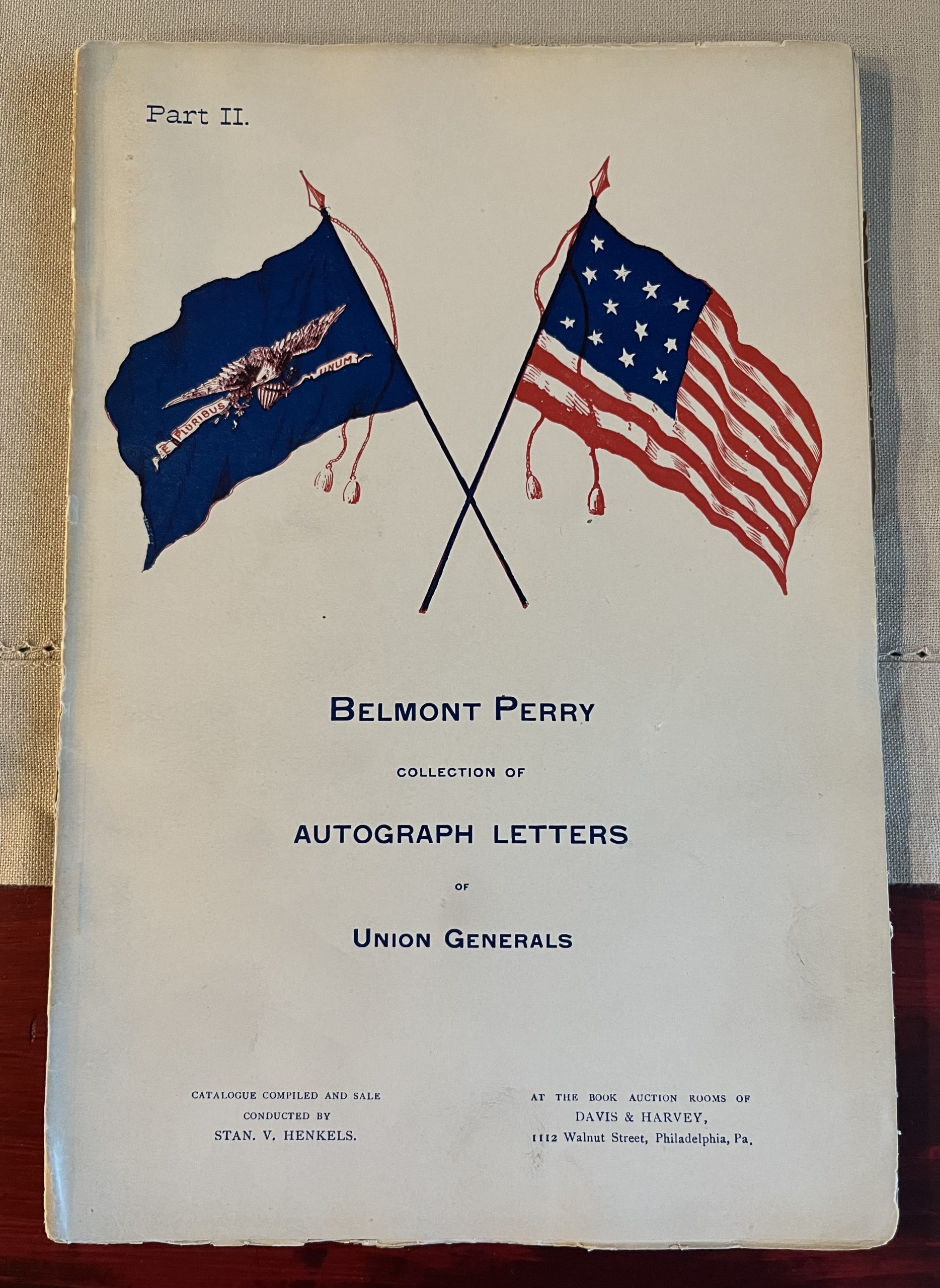 In January 1899, Belmont Perry moved to Pasadena, California, in hopes that it would relieve his poor health. He liquidated many of the artifacts he had collected over the years, including one of the most impressive Civil War autograph collections ever compiled.[7] In May, Davis & Harvey Auctioneers displayed the collection at its auction rooms at 1112 Walnut Street in Philadelphia, Pennsylvania. Auctioneer Stanislaus V. Henkels divided the collection into four separate categories: Confederate generals, Union generals, Confederate statesmen and bishops, and a miscellaneous lot. The auctioneer had a limited number of the catalogs printed. They were too heavy to mail, so he had copies delivered to select addresses listed in The Publishers’ Weekly. Copies could also be ordered by prepaid express. “The catalogue was well made and should be in the hands of every Civil War collector,” editor Walter R. Benjamin wrote in the June 1899 edition of The Collector.[8]