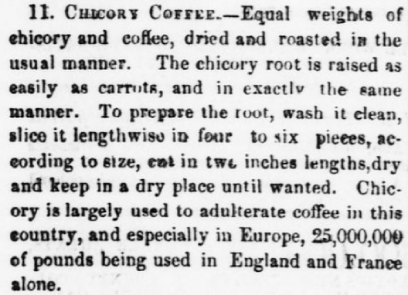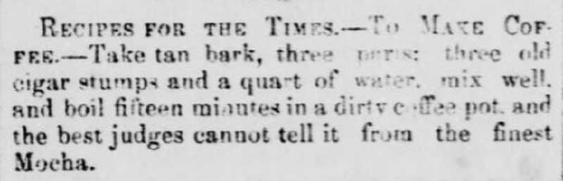 So what do you do when you’re expected to live outside and fight a war – or you’re struggling on the homefront – and you can’t get your coffee fix? Necessity is the mother of invention, and across the Confederacy, civilians and soldiers alike came up with a fascinating range of substitutes: roasting any number of grains or plants that could be grown domestically, including okra, rye and sweet potatoes; using other ingredients to stretch what coffee was left; even a ubiquitous weed called “wild coffee” that was conveniently found in New Orleans.6