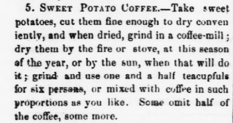 The sweet potato substitute was actually pretty good. As long as we’re grading on a curve, it had a surprisingly full body and rich flavor, and was reasonably easy to prepare. Sweet potatoes would also have been readily available as a substitute in the South. As of the 1860 census, states that seceded grew 90% of the country’s crop.8