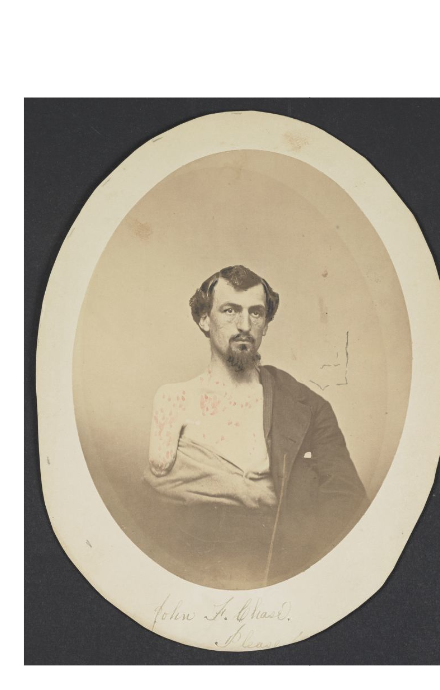 While the image of him without an arm and with visible wounds complete with a false eye is one that evoked shock and pity both in the 1860s and today, rather than a portrayal of failure it actually displays the success of medical practice. Amputations were a necessary procedure that modern Americans often incorrectly view as an unnecessary brutality. Though the wound cost Chase an eye and an arm, the improved methods of Civil War medicine that were in effect by 1863 fought to make sure that it would not cost Chase his life.