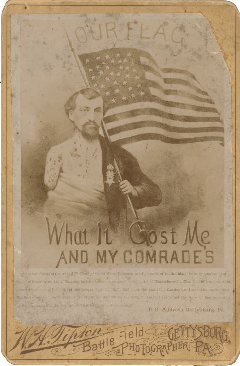 He was discharged in November 1863, and went home to Augusta, Maine. He married, had children, and worked as an inventor registering patents. Late in life, he moved to Florida and set forth on various business ventures. Throughout this, he drew a pension to support himself and his family but certainly stayed active. He also gleaned extra income through the sale of images of himself and serving as an occasional guide for the cyclorama of the battle of Gettysburg. Still, the wound and its effects followed him the rest of his life. In addition to the visible difficulties stemming from the loss of his right arm and left eye, postwar medical evaluations stated he suffered from poor eyesight in his remaining eye, pain in his head, a shortness of breath stemming from scar tissue in the lung, and his right chest which is shown heavily damaged in photos was noted as “one vast, oozing scar.”[4]