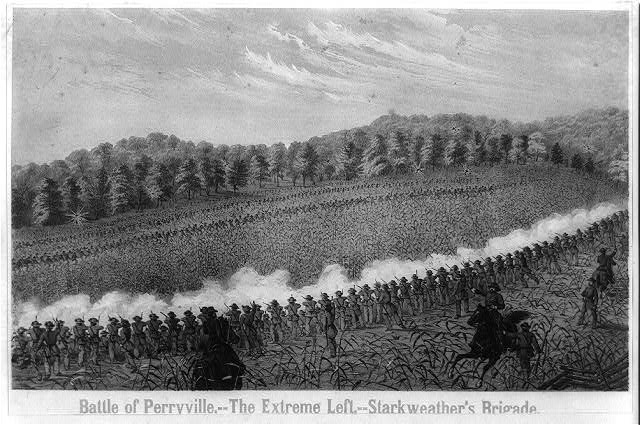 Sixteen decades ago today occurred the largest and bloodiest battle ever fought in Kentucky – the Battle of Perryville (or Chaplin Hills) on October 8, 1862. The engagement pitted Major General Don Carlos Buell’s U.S. Army of the Ohio against elements of General Braxton Bragg’s C.S. Army of the Mississippi outside the town of Perryville. In five hours of fighting, 7500 casualties occurred – one of the worst per-hour casualty rates of the Civil War.