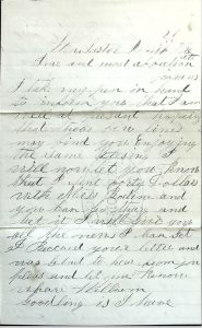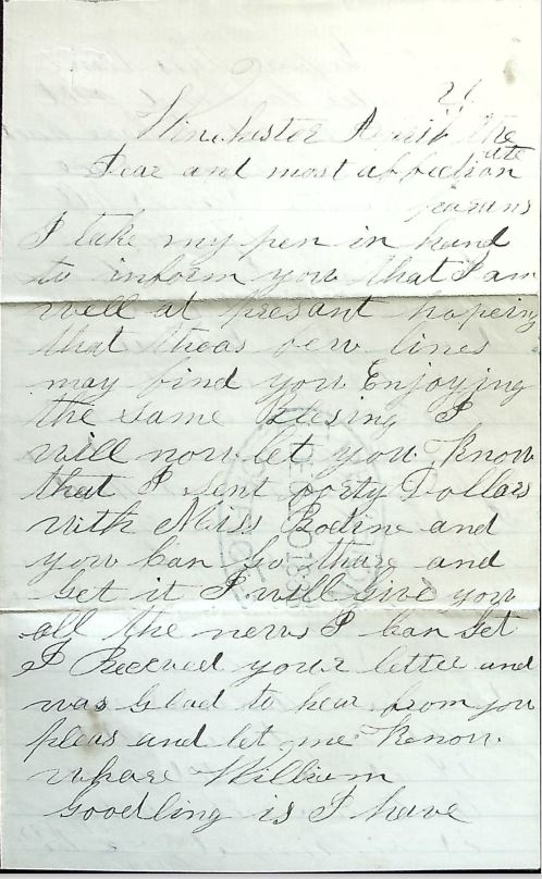 As explored in an earlier post by Douglas Ullman, Jr., pension files can offer immense insight into the lives of soldiers. Sometimes, researchers are lucky enough to find wartime letters written by the soldiers in the file. In this case, my relative Peter Goodling Reever wrote this letter while in camp with the 87th Pennsylvania Infantry around Winchester, Virginia in the spring of 1863. A few months later he was captured at Carter’s Woods/The Second Battle of Winchester, taken to Richmond as a prisoner and eventually paroled. He returned to the regiment, was slightly wounded at Petersburg and captured for a second time at Monocacy. He was taken to the prison in Danville, Virginia, where he died. (See my earlier blog post for this story.) While some elements of his service were noted in other sources, the pension file (as well as his service record, also stored at the National Archives) filled in several gaps that I couldn’t find answers to elsewhere. Postwar, his mother filed this pension paperwork, though she was ultimately denied due to local affidavits that she and Peter’s father did not rely on financial support from their son at the time he was in the army. As far as I know, this is Peter’s only wartime letter that survived, and it only exists today because his mother sent included it in her pension paperwork. It was chosen not necessarily for any poignant text or important discussion of military actions, but because it notes that he sent money home to his parents.