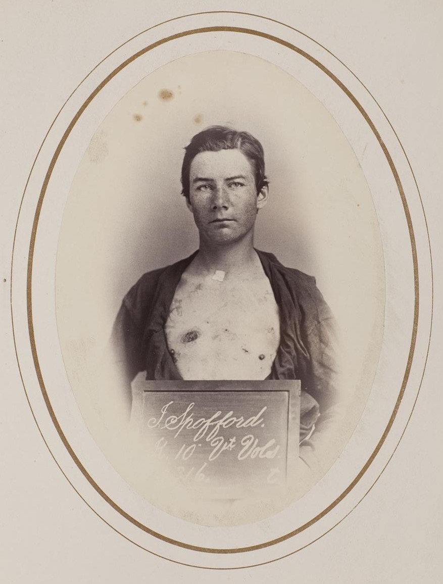 Drawing a piece of silk cloth through the wound from end to end in attempt to clean it, clear the clots, and remove pieces of clothing carried into it, Spofford’s wounds then received bandaging. Eventually evacuated to Lincoln Hospital in Washington D. C., where a doctors photographed his wound, he then went on the Sloan General Hospital in Montpelier, Vermont, for extended recovery. Spofford’s Civil War was over as his comrades pursued Lee’s army to Appomattox, and then served on occupation duty in Virginia. Although Pvt. Spofford technically mustered out with the 10th Vermont in the summer of 1865, not being with the regiment, he never received a formal discharge. He wrote to get one in 1867.
