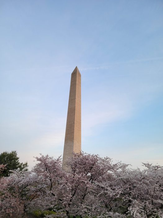 Continuing west, we get a lovely view of the Washington Monument. The cherry blossoms are still here this morning. Their peak bloom has passed, but the soft pink and white is still gorgeous in the early morning light.