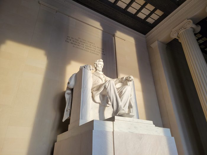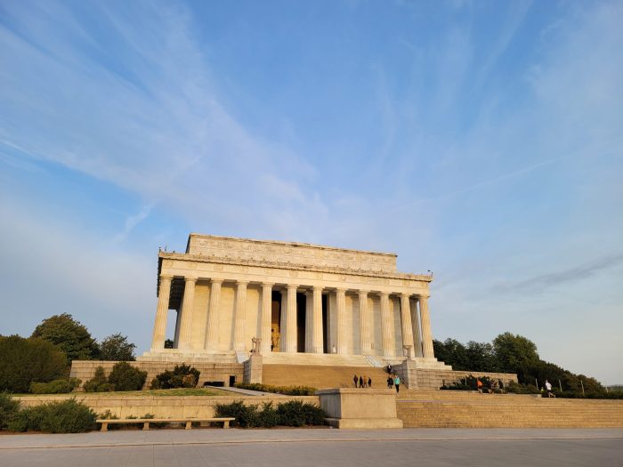 The Lincoln Memorial dominates the monument landscape here, and we head west and up the flights of marble steps. Completed in 1922, the Lincoln Memorial in Washington D.C. is one of the most iconic tributes to the 16th President of the United States. Within the Lincoln Memorial, the Gettysburg Address is etched on the wall—a reminder of Lincoln’s efforts to give commitment and meaning to the losses and sacrifices of the Civil War.