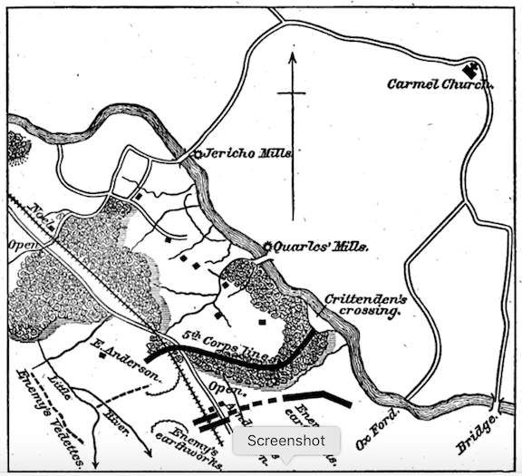 By the morning of May 25, Warren moved the rest of his corps eastward, with Wright securing Warren’s right flank. Wright, in turn, protected his own right flank using the Little River to his south. In this way, the two corps advanced to try and get a better idea of the shape of the Confederate line. They eventually got their answer when they ran into A. P. Hill’s Third Corps, which made up the west-facing leg of a large inverted “V,” with Mahone’s men at the northern tip of the spear at Ox Ford.