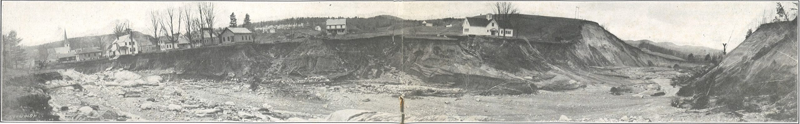 In early November 1927, the remnants of a tropical storm struck Vermont, causing torrential downpours and catastrophic flooding throughout the state. As the Black River rose it tore away the embankment supporting the structures along Cavendish’s main road. Fortunately, a quick-thinking peddler on the road late at night—who abandoned his own vehicle just before it washed away—managed to alert the nearby residents of the danger. One by one, eight buildings disappeared into the chasm, but remarkably everyone in town survived. Compassionate neighbors carried Lucy and her eighty-eight-year-old sister out of the house just before it slid into the darkness.[28]