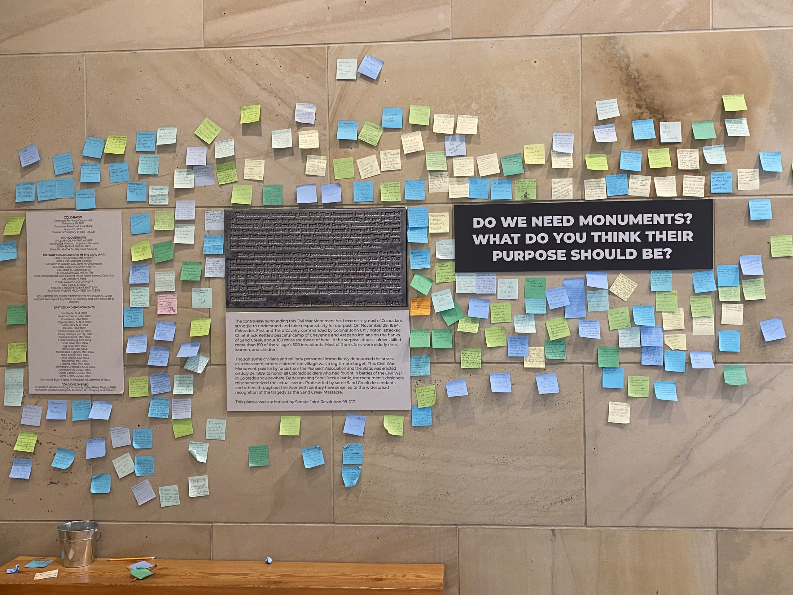 The primary objection to the monument was that it listed the Sand Creek Massacre as a battle, on par with engagements like Glorieta, effectively glorifying a one-sided slaughter of Native women and children. After the protests, History Colorado volunteered to house the monument going forward.