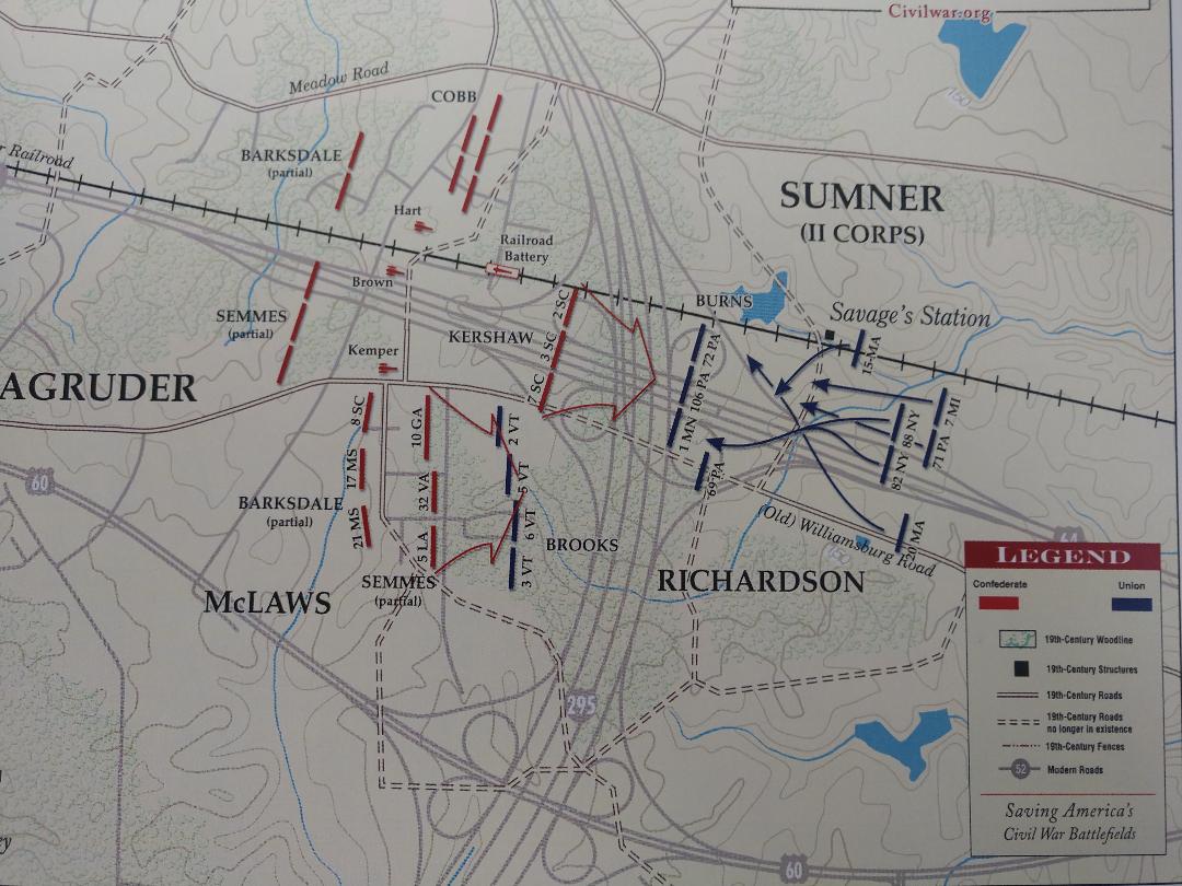 The June 29, 1862 battle of Savage’s Station is one of the forgotten battles of the war. Part of the Seven Days’ campaign outside of Richmond, it was a Union rear guard action to hold off pursuing Confederates. The bulk of the Army of the Potomac was moving south to the James River, and Confederate forces under Gen. John B. Magruder advanced to engage, while Gen. Jackson would support him.