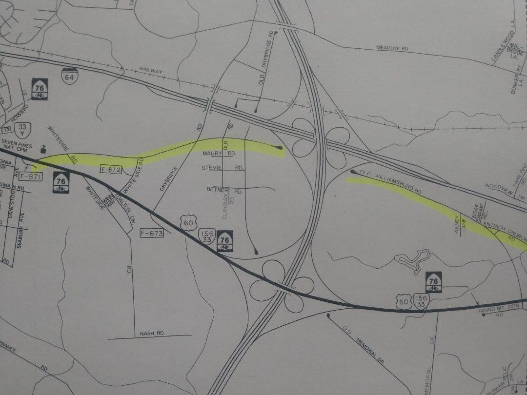 The heart of the battlefield unfortunately was destroyed by the construction of Interstate 295 east of Richmond, built in the 1980s. In fact the cloverleaf interchange between Interstates 295 and 64 seem to be built though the very center of the area of fighting. V-DOT could not have planned it any better. Yet it is still possible to access peripheral areas and the Union and Confederate approaches along the Old Williamsburg Road. This was the wartime road, later replaced by US. 60, now called Williamsburg Road.