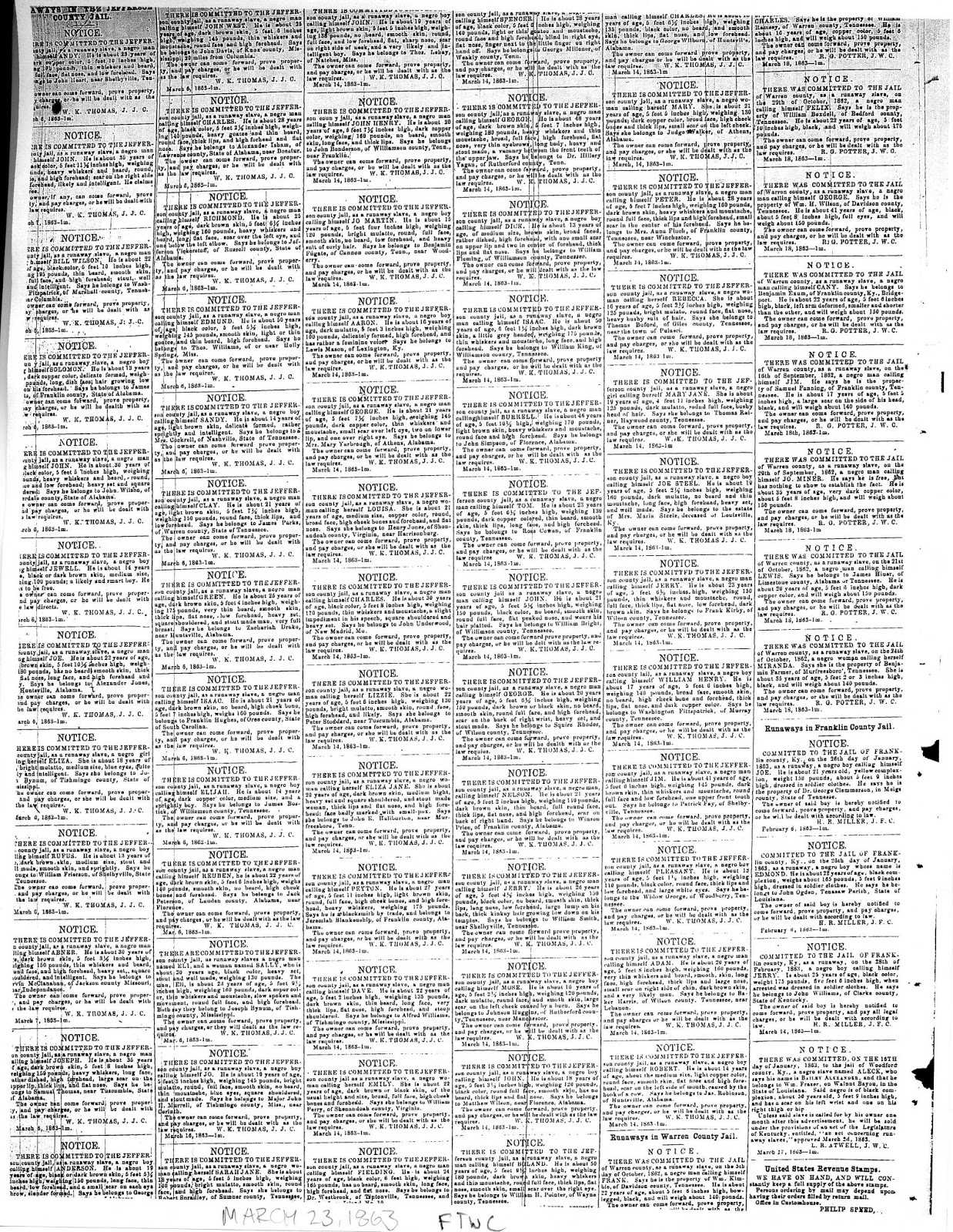 The new laws had little effect on curbing runaways. Providing excellent evidence of this fact is a page of the March 23, 1863, edition of the Tri-Weekly Commonwealth. Over 75 notices of captured and jailed enslaved people fill the page. Information gained from the enslaved individuals about their backgrounds showed they came from Kentucky, Tennessee, Alabama, Missouri, Mississippi, Virginia, and Louisiana. At least two individuals claimed to be free [iii].