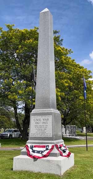 The town erected a wooden Civil War memorial in the cemetery in 1889. Thirty-eight years later, members of the Jane Carver Sampson Tent No. 18, Daughters of Union Veterans of the Civil War, started raising funds for a permanent memorial. A large crowd watched as the gray granite shaft was dedicated at the cemetery on May 20, 1931. The Jane Carver Sampson Tent disbanded years later.