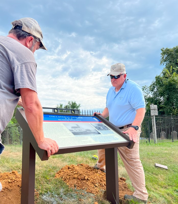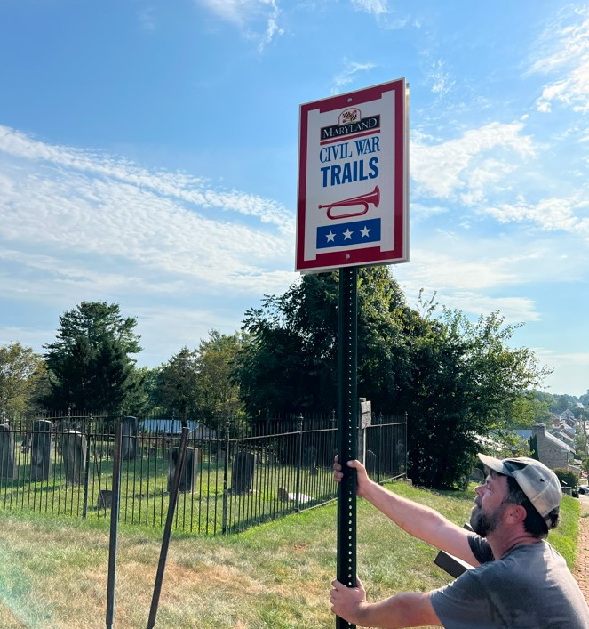 Recently, members of the Antietam Institute helped hoist a new set of Civil War Trails signs into place where the Mount Calvary Lutheran Church once stood. This is the first Civil War Trails (CWT) site in downtown Sharpsburg officially adding the beautiful community to the multi-state program. The church was damaged beyond repair during the September 17, 1862 Battle of Antietam.