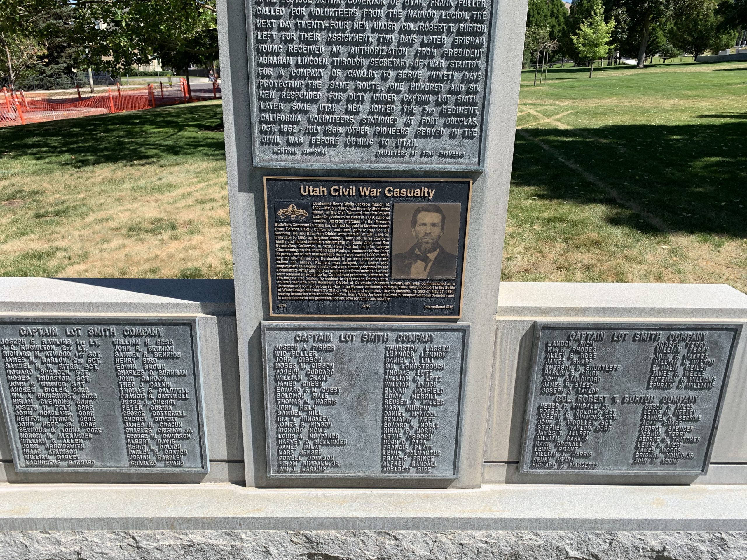 We reached Utah’s capitol on a bright clear day and immediately went looking for the Civil War monument on its grounds. After a few minutes of searching, we found it, with the capitol building overlooking the site. Not very large, there are no obelisks or statues in the state’s only Civil War monument which was erected in 1961. It instead takes the form of five placards highlighting the people who volunteered to defend Utah and fight on behalf of the United States. One placard explains how Utah soldiers came to volunteer during the war, and three others list the names of all volunteers from both Burton’s militia and Smith’s company. Finally, there is a recent addition. A newer placard was added in 2015 to honor Henry Wells Jackson, the Utah man who died fighting in Virginia.