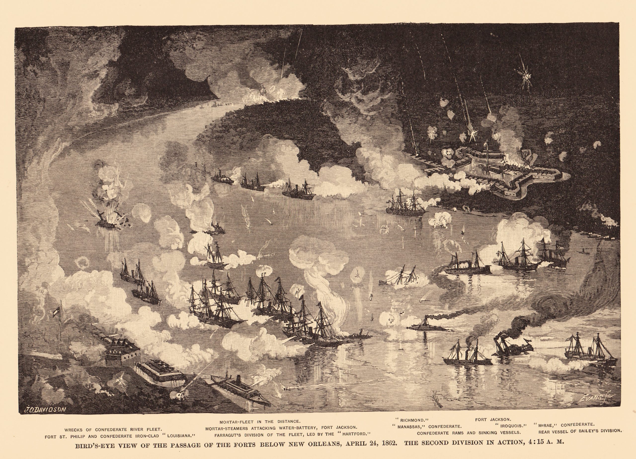 In the “Capture of New Orleans” lithograph, Admiral David G. Farragut’s flagship, USS Hartford, leads the column of warships past Fort St. Philip (obscured on the left in smoke and fire) and the ironclad CSS Louisiana. Tiny figures on both vessels fire musket and cannon. The Rebel tugboat Mosher pushes a flaming fire raft against Hartford’s port side while the cigar-shaped ironclad CSS Manassas approaches from the right.