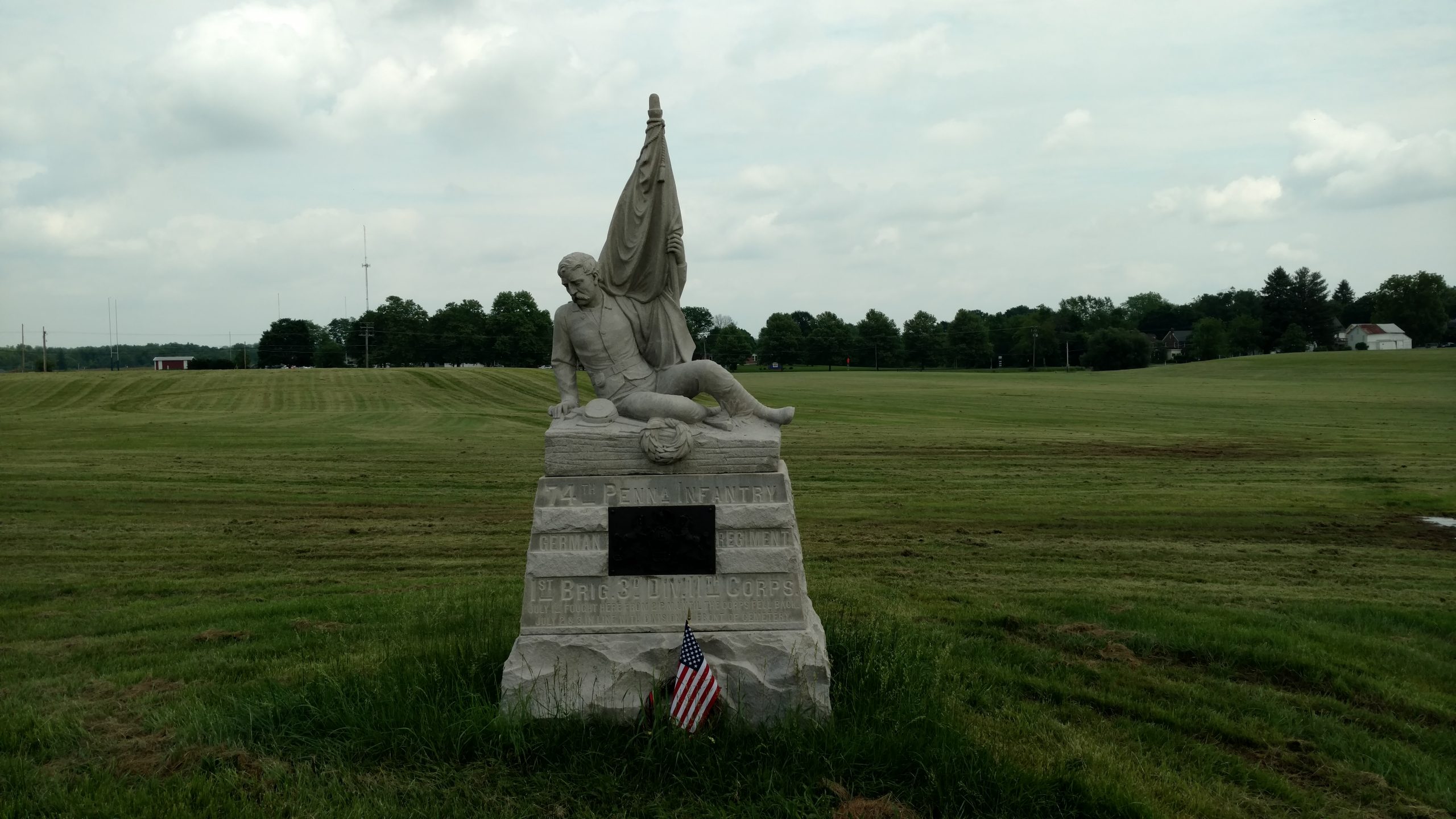 Thus, the 74th Pennsylvania marched north in June 1863 with the hope that their performance in the next battle would clear their name. On the morning of July 1, the regiment broke camp in Emmitsburg, Maryland and began their trek toward Gettysburg. As they crossed the Mason-Dixon line, Roth and his men could hear the distant rattle of musketry and echoing thuds of artillery.[6] The Pennsylvanians marched at the double quick through town and onto the battlefield, where they deployed on flat land north of Gettysburg along with the rest of the Eleventh Corps. Here, Roth and his men intercepted the Confederates along the Carlisle Road. The Pennsylvanians stood firm, but a renewed attack late in the afternoon forced the entire corps to withdraw from the field once again. With their position compromised, the men of the seventy-fourth dashed back through town to their rallying point on Cemetery Hill.