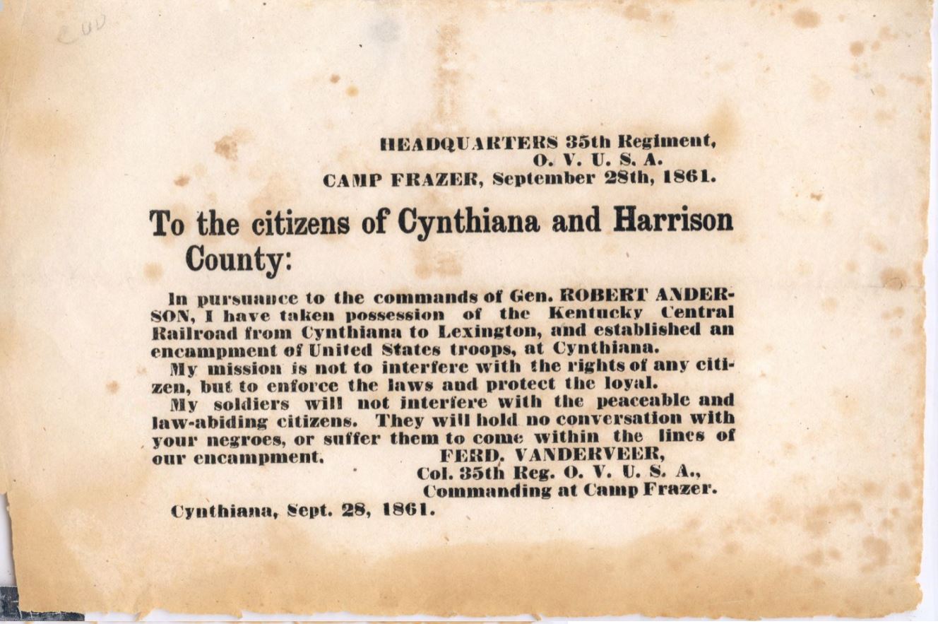 On September 28, 1861, Col. Ferdinand Vanderveer issued a handbill notifying the “citizens of Cynthiana and Harrison County” that under the orders of Gen. Robert Anderson—the hero of Fort Sumter, who then commanded Kentucky—Vanderveer had “taken possession of the Kentucky Central Railroad” and “established an encampment of United States troops, at Cynthiana.” Colonel Vanderveer explained that he was there “to enforce the laws and protect the loyal.” To clarify what that meant for slaveholders, Vanderveer further noted that his soldiers “will hold no conversation with your negroes, or suffer them to come into the lines of our encampment.”[1]