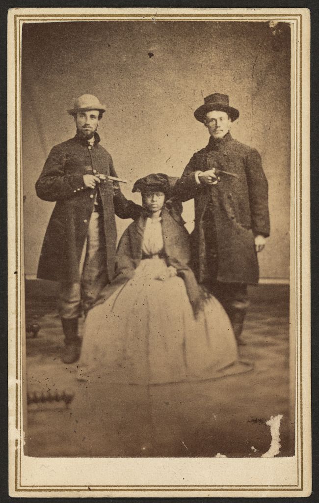 While in Cincinnati, the trio took an opportunity to have their photograph made at J. P. Ball’s Photographic Gallery on West Fourth Street. The image shows the formerly enslaved woman wearing a modest dress, shawl, and hat, seated between Corp. Rockwell and Sgt. Berch. Both soldiers hold pistols in their right hands as a show of protection for the woman. In addition, Berch and Rockwell telegraphed to friends in Racine, Wisconsin, to expect the woman soon. Coffin noted that “She was nicely dressed, and wore a veil, presenting the appearance of a white lady.” Doing so helped ensure that she had a first-class seat on her trip north. Coffin recalled that after her train pulled away Berch and Rockwell remarked that “it seemed one of the happiest moments of their lives when they saw her safely on her way to a place beyond the reach of her pursuers.”[4]