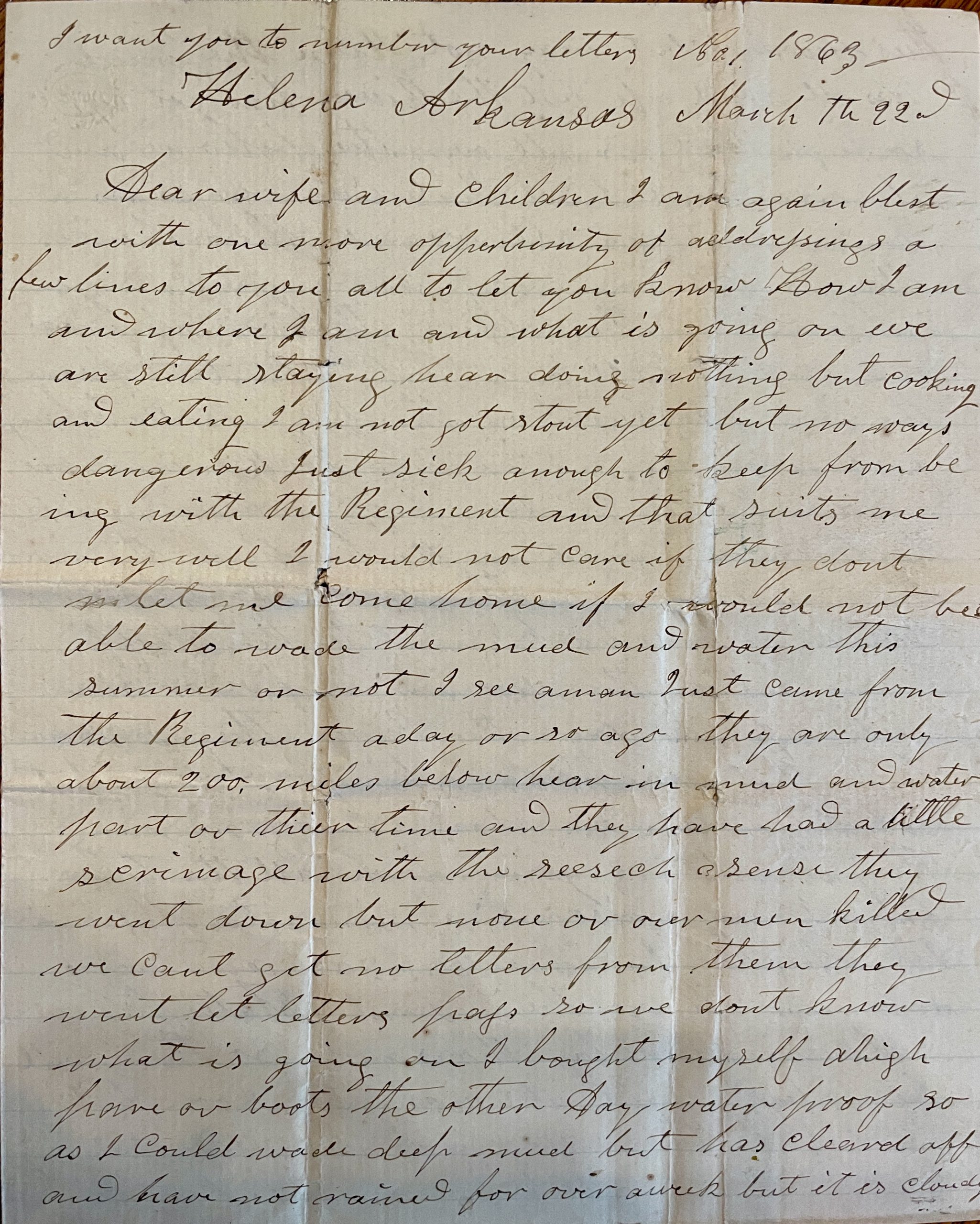 I am staying at camp in Helena. My rheumatism is giving me pain in my back and hip, so I can’t go with the Regiment. I bought some medicine so that if I get sick, I can take care of myself. If a man gets a little sick and gives up, he will die certain. Lots of men have died, but I never give up. I am in good spirits and I will keep, so that is half the battle. I hope I will be at home some time, but I cannot tell when. I want you to keep me in your heart….