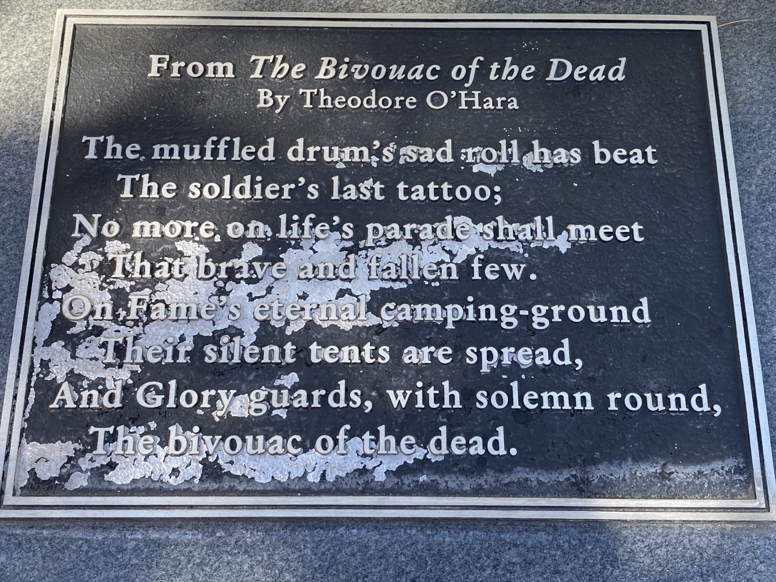 Santa Fe National Cemetery contains monuments and plaques recalling a number of speeches and works of art. One of these, written in the late 1840s by Theodore O’Hara, has particularly stuck with me since that visit: