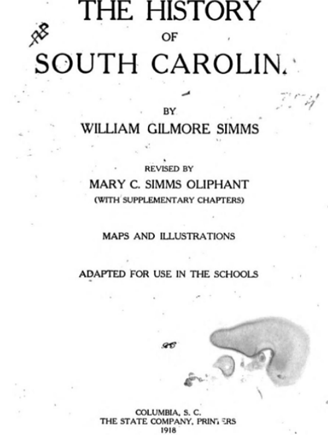 I wanted to look at what South Carolina school children learned about the Civil War and the Reconstruction Era in the early 20th century by reading the leading textbook on the history of South Carolina. The Simms History of South Carolina had been published by William Simms in 1860. In 1916, the South Carolina state superintendent of education asked his granddaughter Mary Simms Oliphant to author a new adaptation of the book. It would become the standard eighth grade South Carolina history textbook in that state for nearly half-a-century.