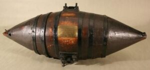 The conference being over, the army officers, accompanied by the Admiral, came down this ladder to the fantail, and were about embarking on the row-boat with which they had reached the flag ship, when their attention was attracted to the torpedo which lay at their feet. They gathered around it with expressions of interest and curiosity as it was the first seen in the war. It was a formidable affair, being an iron cylinder about five feet long and eighteen inches in diameter, pointed at both ends, with a long iron rod projecting upward, terminating at one end in three iron prongs to catch the bottom of the boat passing over it and connected at the other end with an ordinary musket lock which was fixed to explode a cap.