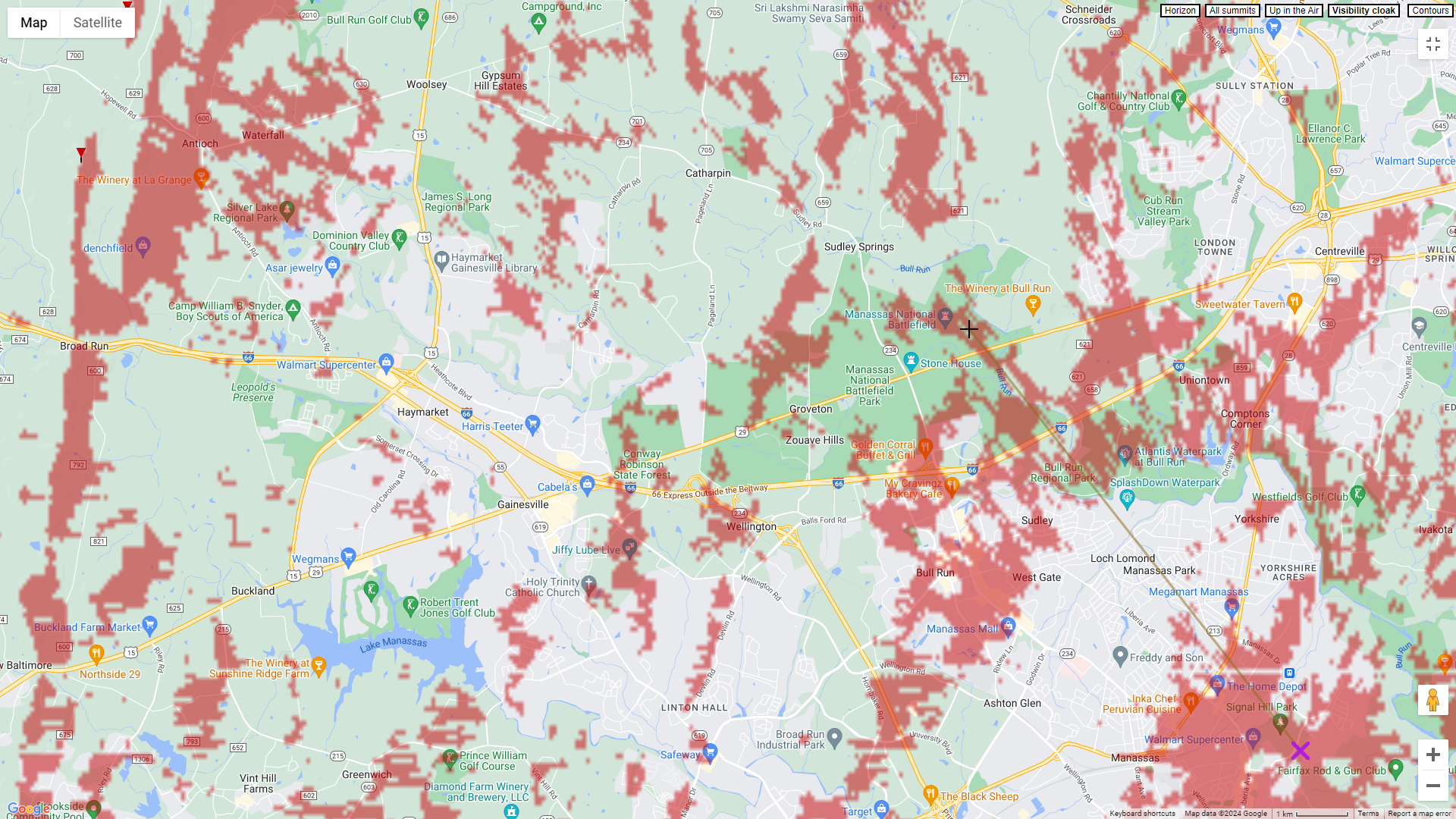 The areas shaded in red show what Alexander could see from Signal Hill, which is denoted by the X toward the bottom right of the image. The other X on the map is the approximate location of the Van Pelt Hill station.