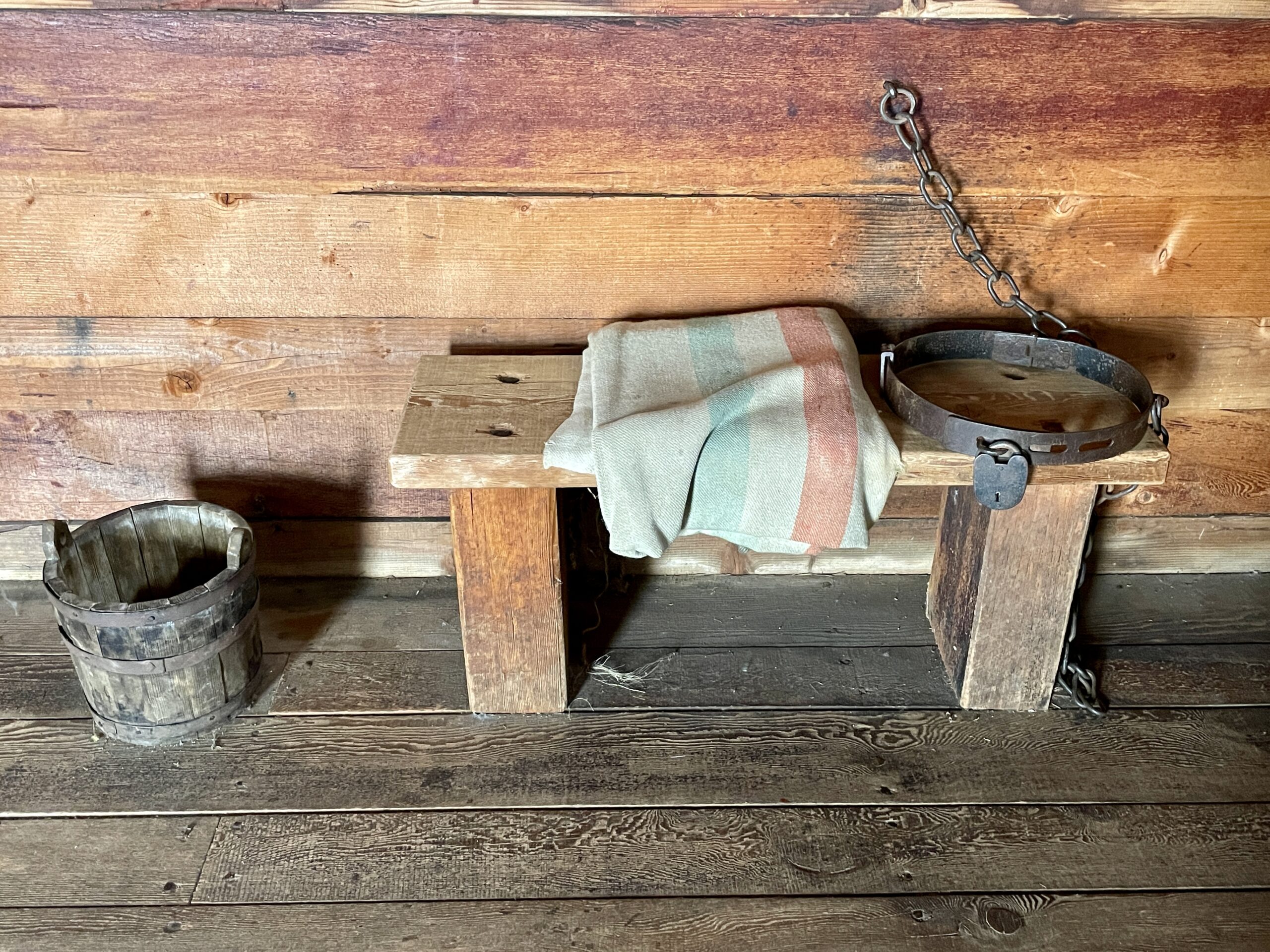One of the largest buildings at the fort is the Chief Factor’s House, and “everything about this house was designed to impress – the height, the staircase and veranda, the paint colors, the flower garden, and the cannons placed in front. As the center of economic, social, and political activity, this building housed the top two officers at the post and their families. The building’s central feature – a large hall – provided facilities for officers of the HBC and their guests to dine and enjoy holiday celebrations, religious services, weddings, and even an election under the provisional government.” [2]