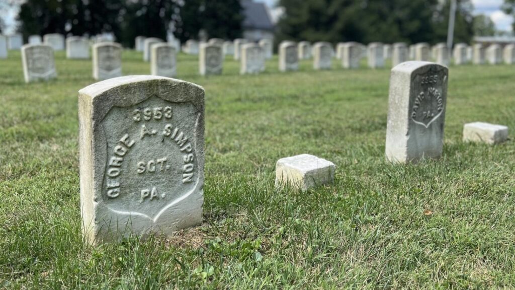 The men of the 125th Pennsylvania honored George Simpson in life and death. In life, he received the honor of carrying the regiment’s colors into battle. In death, Simpson stands in stone, forever holding the regiment’s flag. He is the only soldier buried in Antietam National Cemetery also represented on a battlefield monument.