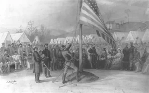 On October 19, 1864, Lt. Gen. Jubal Early’s Confederate force ambushed Sheridan’s army encamped along Cedar Creek near Middletown, Virginia. Early succeeded in driving three Union corps from their positions, but Sheridan’s arrival from Winchester in the afternoon turned the tide of battle. He rallied the Union army in a counterattack that crushed the Confederate offensive.[3]