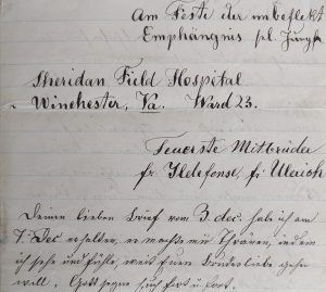 For nearly a month, Gaul and the other orderlies tended to both Union and Confederate soldiers in the field hospital. “Day and night for 30 days there was no rest. Ach, how many died in my arms!” he lamented. Then he described how the VI Corps triumphantly repulsed the rebels while the VIII Corps “ran like dutchman.” “If General Sheridan had not come at the right time,” Gaul professed, “we would have been beaten back 30 miles.”[5] Gaul took great pride in the VI Corps’ role in winning the battle of Cedar Creek. “Our corps certainly deserves the honor,” he boasted to his friend, writing that they “fought with the rage of lions.”[6]