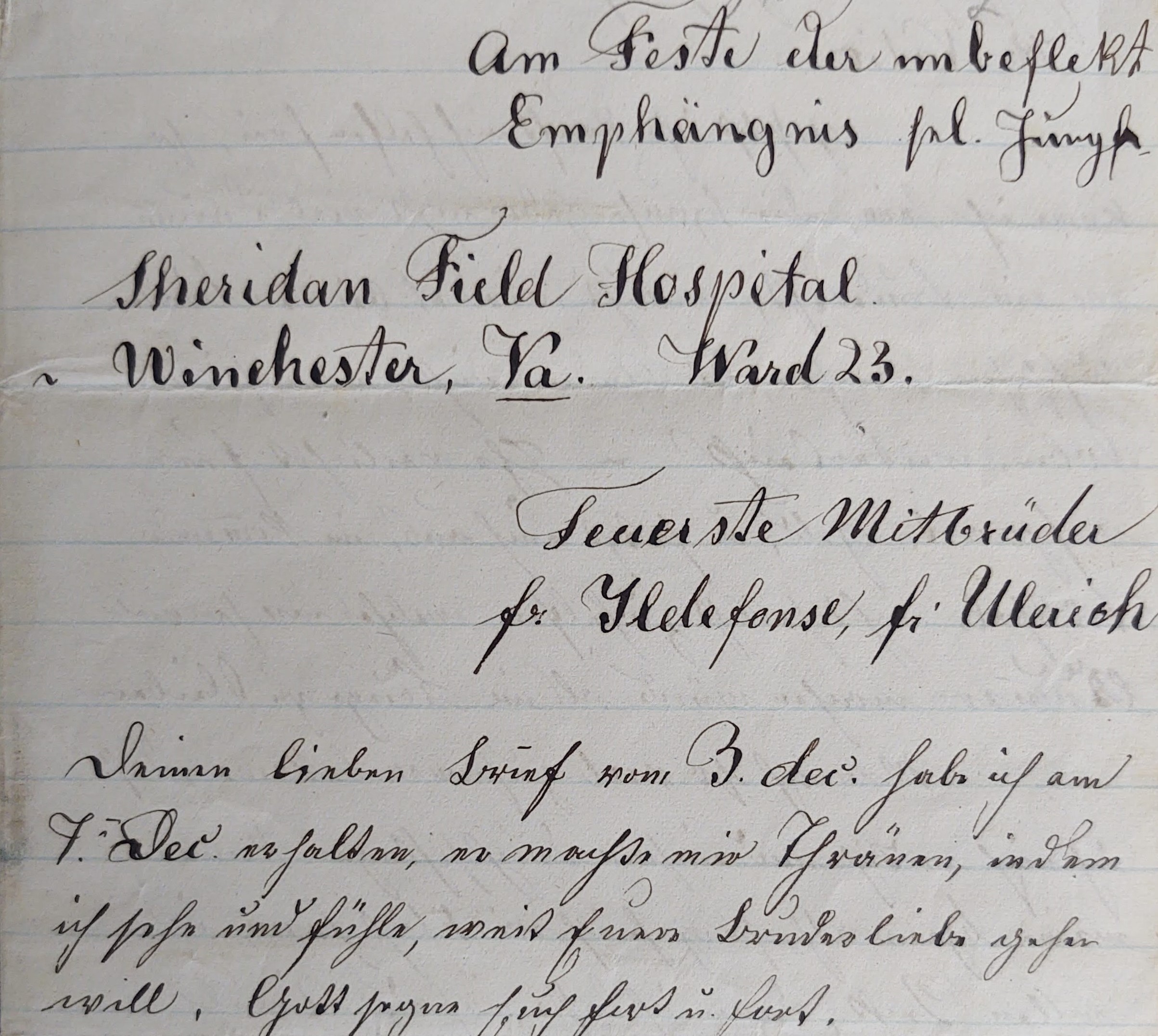 Gaul did not witness the fighting firsthand, but he watched as casualties trickled into the Sheridan field hospital in Winchester. On October 24, exactly 160 years ago today, he wrote his friend and fellow monk Brother Ildephonse Hoffmann about the horrific sights of the hospital. “I have experienced more than 30 battles; but this one seized me for sheer sympathy.”[4]