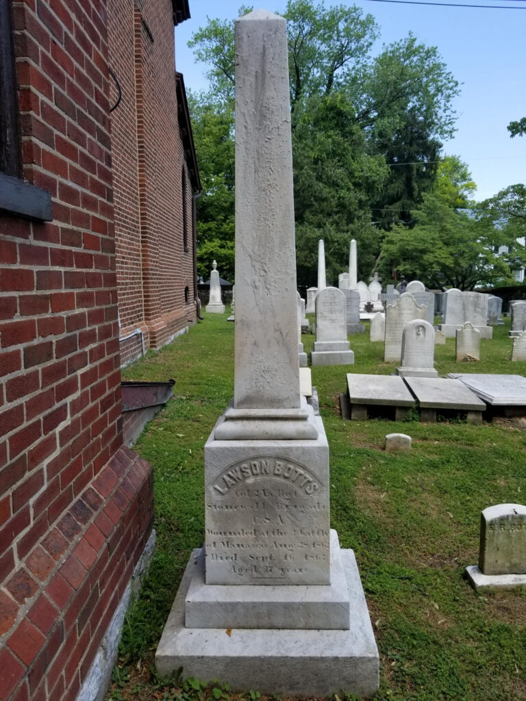 Botts’ remains rest in the Zion Episcopal Church Cemetery in Charles Town, West Virginia. Also buried there is George Turner, one of the civilian casualties of John Brown’s Raid. Botts came to Charlestown “poor and unknown” in 1846. “When he died, few, if any in his county, exerted a more solid influence, or had a larger circle of friends and admirers.”
