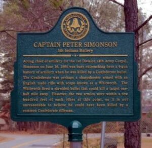 Accompanying them was Capt. Peter Simonson, along to supervise the construction of these artillery embrasures. To maintain contact with the 5th Indiana Battery and direct its fire, Simonson formed a “human telegraph line” using volunteers from the battery, stationed at “intervals of about 35 yards.” Not long after he went forward, however, a Confederate “sharpshooter” shot him in the forehead, killing him instantly. He was widely mourned. Major General Stanley deemed his demise “an irreparable loss to the division.” Lieutenant Chesley Mosman of the 59th Illinois, whose pioneer detachment was helping to build these new works, thought that “it was too bad. He was a splendid officer.” Later, Stanley wrote that “he was my favorite artillery officer.”[2]