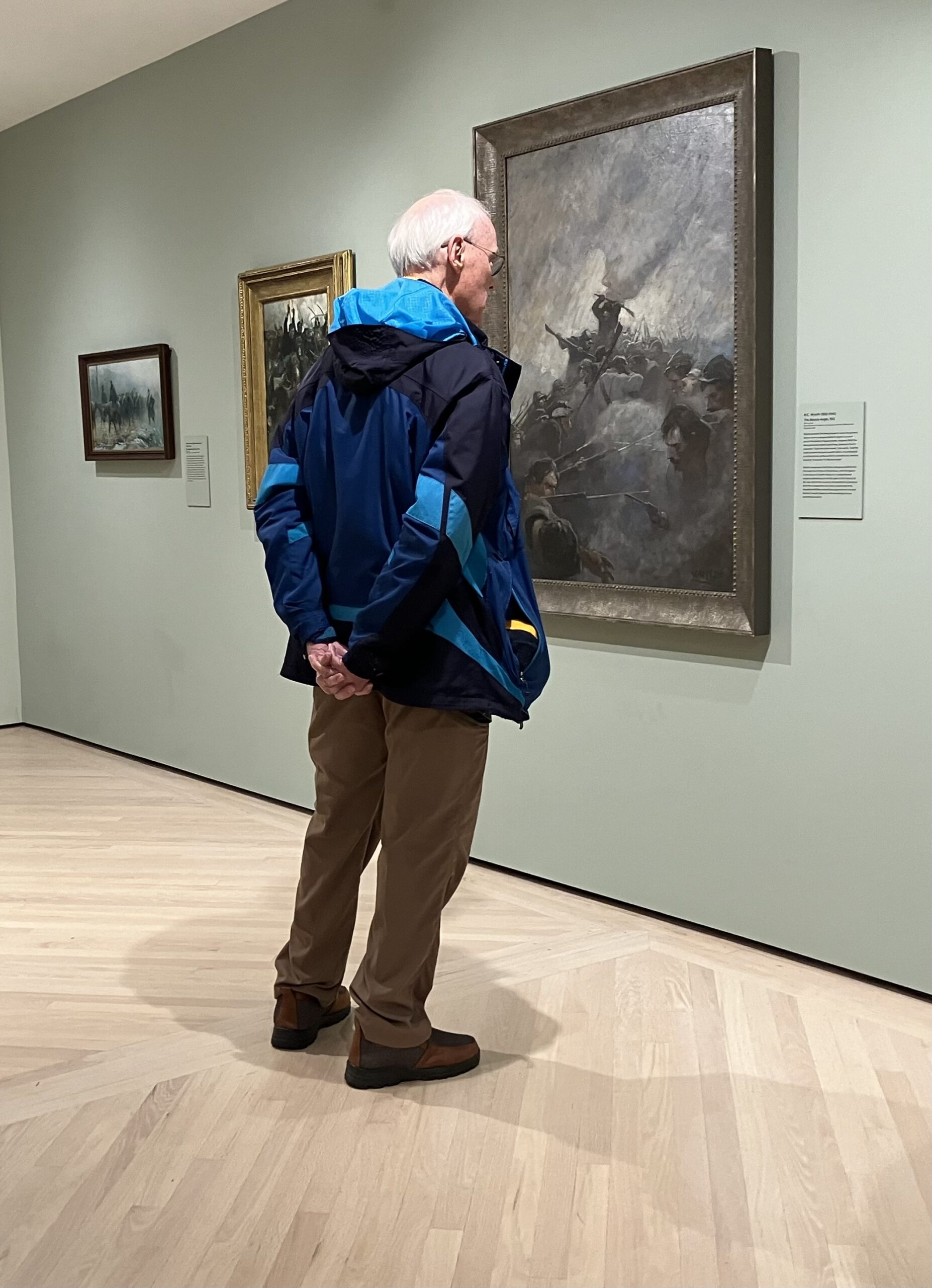 Leisurely strolling along a wall lined with beautiful but bucolic works, I was stunned when suddenly confronted with a huge painting by N.C. Wyeth entitled “The Bloody Angle.” With due respect to Künstler, Troiani, et al., this was the most powerful piece of combat art I have seen.