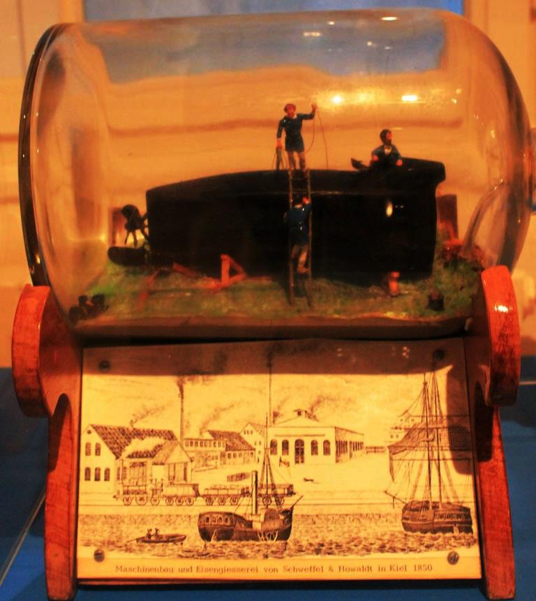 Wilhelm Bauer was an officer of artillery under the Duke of Holstein in the German/Danish war for Schleswig-Holstein from 1848-1851. In January 1850, Bauer drafted a proposal for an underwater vessel to break the Danish blockade by attaching explosives to a ship’s hull. Bauer first gained approval for a miniature clockwork model and then a full-scale submersible. With insufficient funds, Bauer had to cut back on components, reducing operational depth to only thirty feet, as opposed to the planned 100. The submarine, christened Der Brandtaucher (Diving Incendiary), was towed into the water on December 18, 1850.[3]