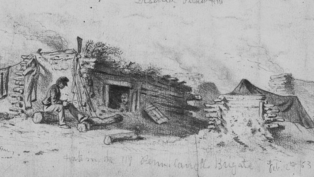 Peering from the window of a roughly assembled cabin, a soldier watches a comrade who sits on a log while (perhaps) reading a letter from home. This sketch depicts different styles of winter quarters. (LOC)