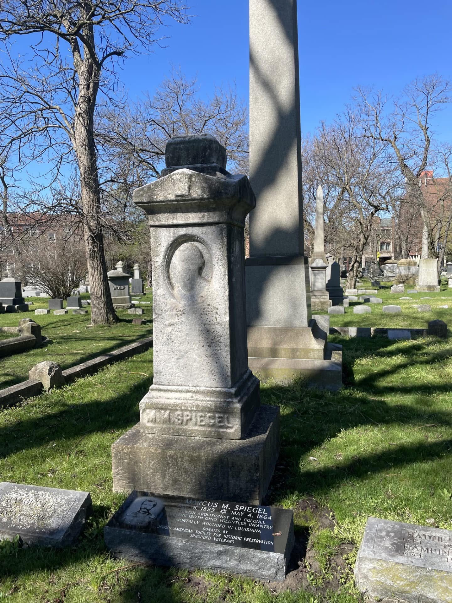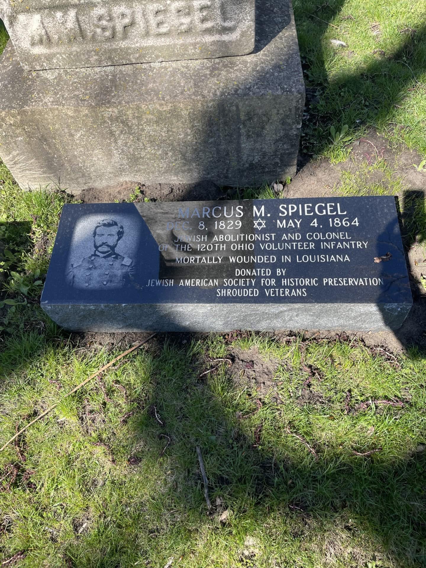 Over time, his portrait and epitaph eroded, becoming so badly weathered that the details of his likeness were smoothed, his features unrecognizable, and the words illegible except for the faint “M.M. Spiegel” at the bottom of the marker. In 2024, the Jewish American Society for Historic Preservation and Shrouded Veterans successfully placed a private headstone at the base of Spiegel’s original marker to ensure the colonel was properly honored for his service and sacrifice for years to come.