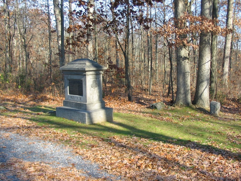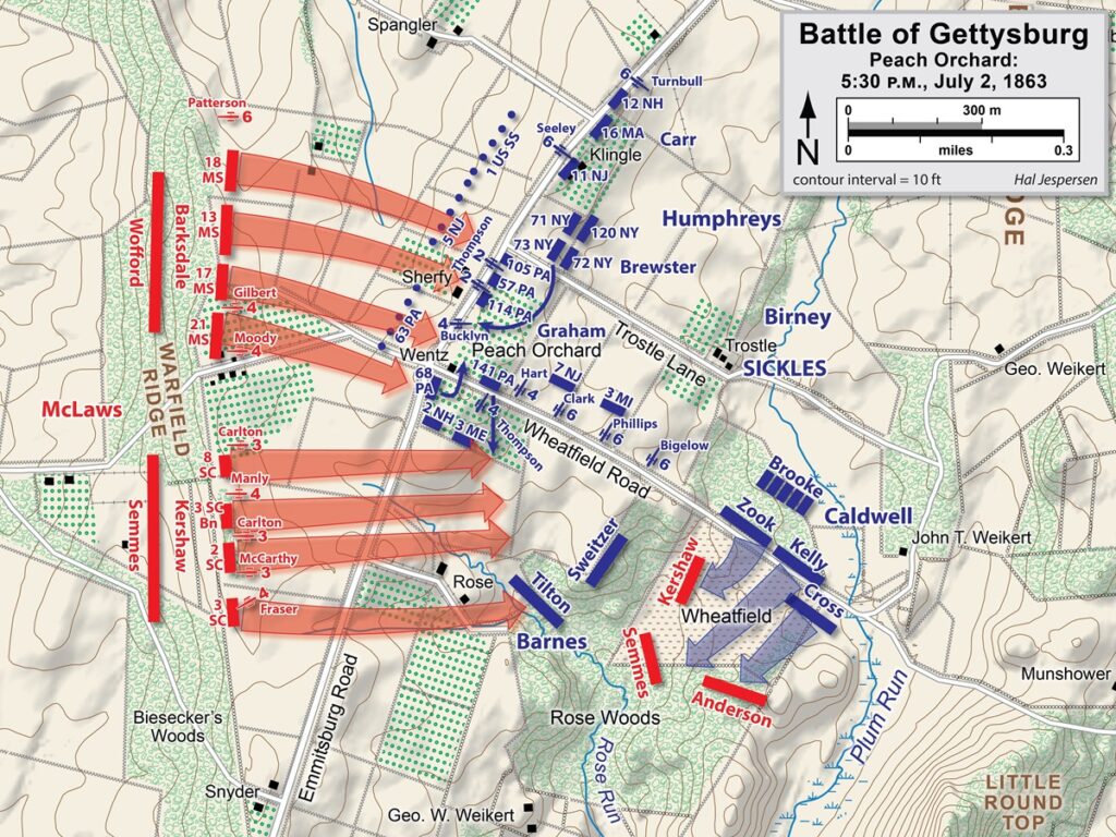 As Gettysburg’s second day raged, after 4:00 p.m. John Caldwell’s first division of Maj. Gen. Winfield Hancock’s II corps was ordered to support the left of the Union left in the area of the Wheatfield, Stony Hill, and Rose Woods. The 140th Pennsylvania, along with the rest of Zook’s brigade, was directed toward Stony Hill, which placed them in difficult terrain including massive rocks and trees, initially facing the men of Joseph Kershaw’s 2nd, 3rd, and 7th South Carolina regiments.[9]